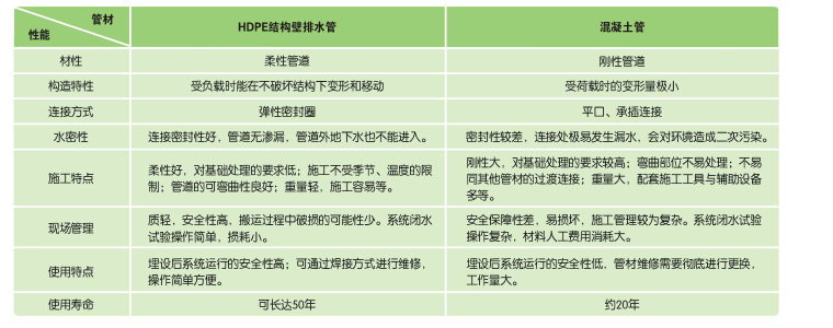 HDPE結構壁排水管的優勢是施工方便、快捷。由于該管材宏觀上具有很好的柔韌性,為“管道與回填土作用”系統承力結構,而在局部管段又有很強的剛性,因此,在管道施工過程中不需設置混凝土墊層或混凝土管基,可在溝槽內直接敷設,基本可以做到邊開邊挖、邊下管、邊回填,節省了工期;簡化了施工程序,節省了人力、物力,經濟效益及社會效益顯著。下表為HDPE雙壁波紋管與混凝土管的性能比較。
