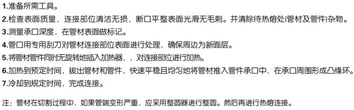 6、熱伸縮性好,連接方式先進。連接方式可采用一體化熱熔連接,在埋設時,可避免因溫度變化和水錘現象引起管的移動及連接處的滲漏。