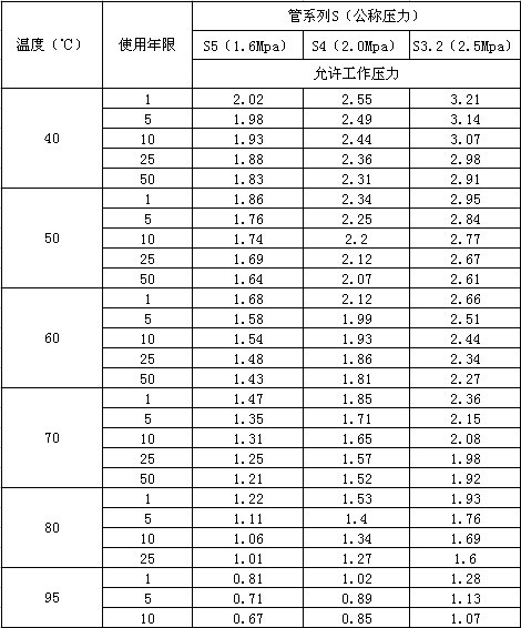 PB管道設計溫度、工作壓力使用壽命的對應關系表格